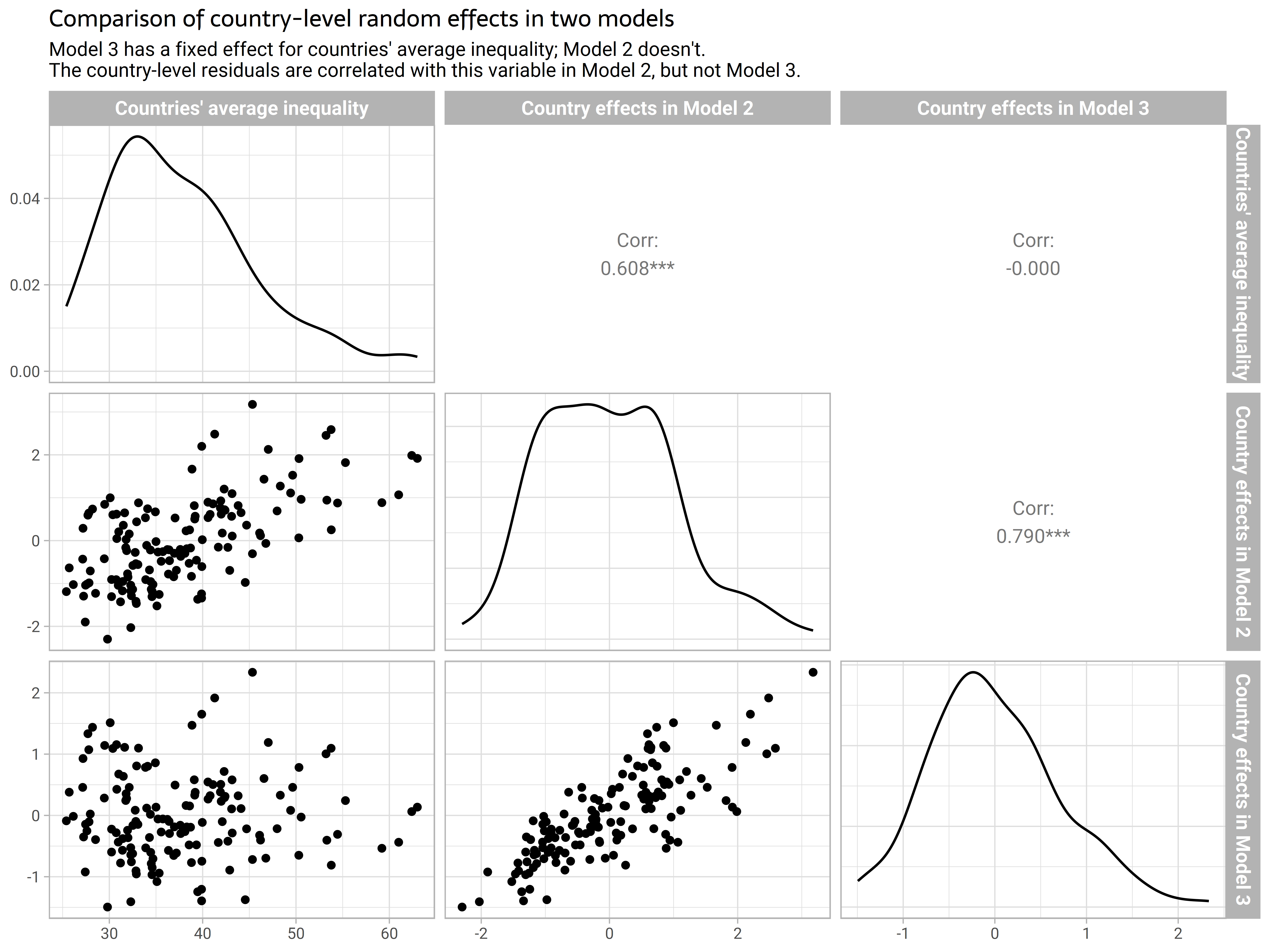 The country-level residuals are correlated with this variable in Model 2, but not Model 3.")