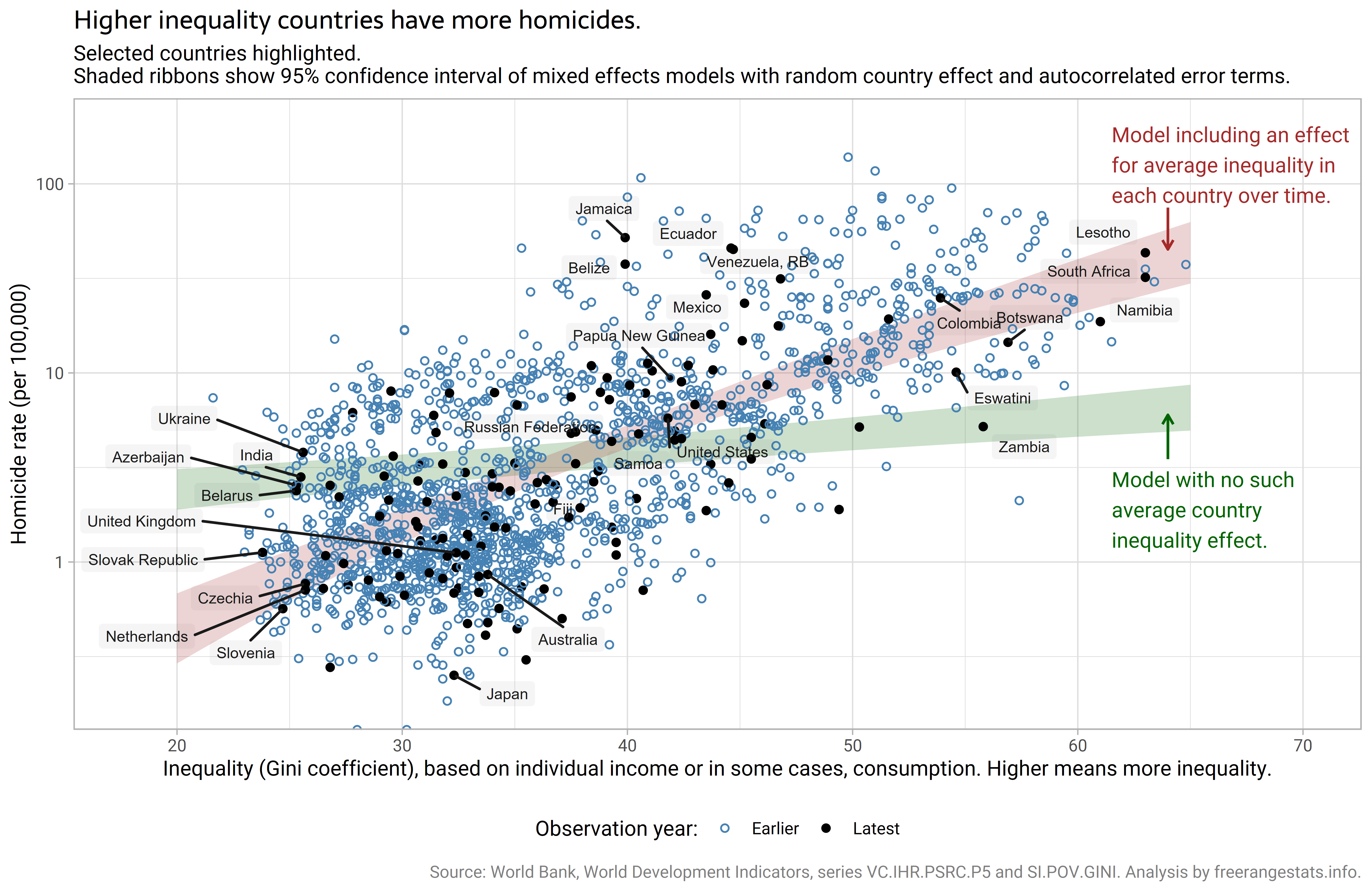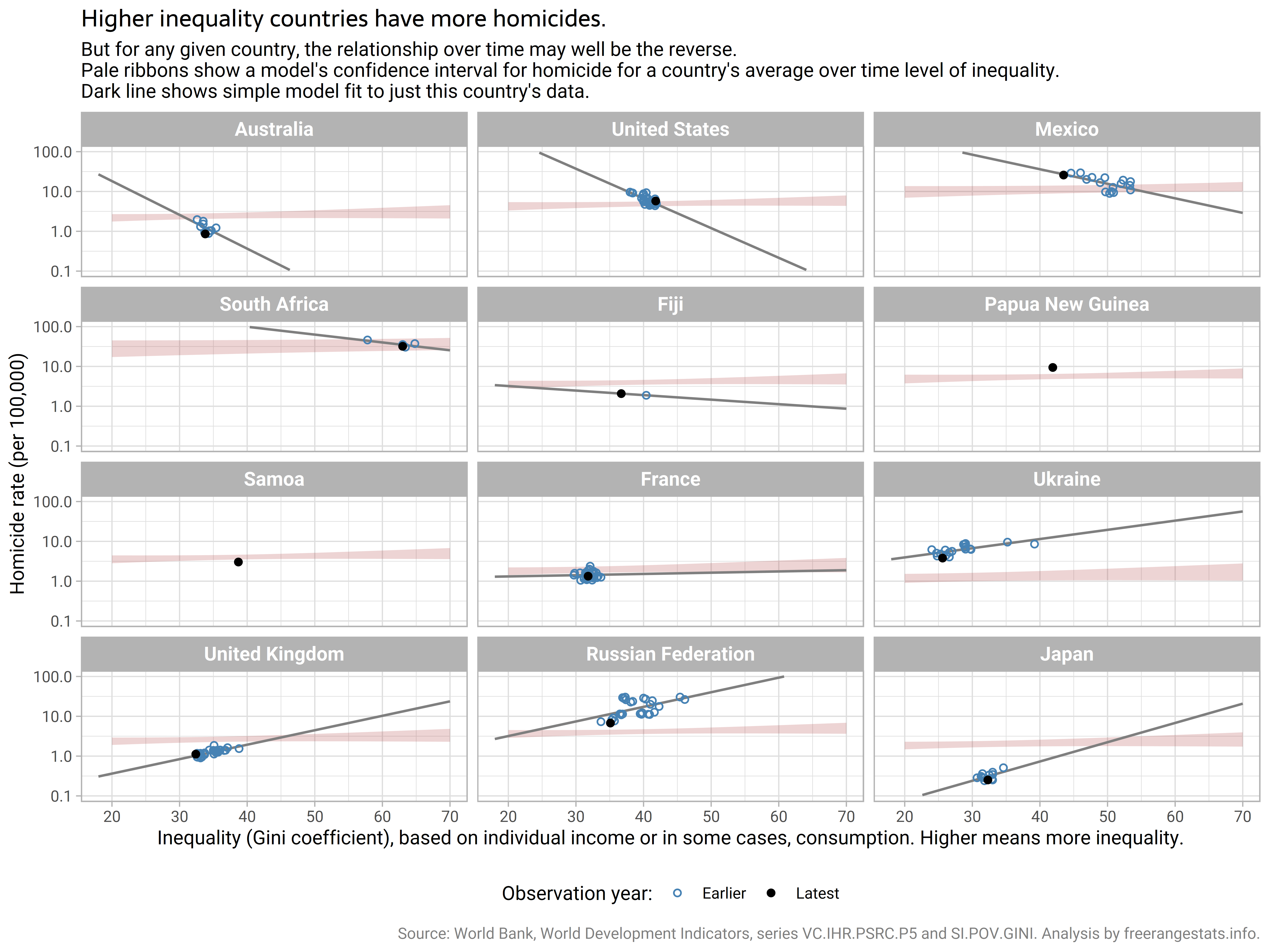 Pale ribbons show a model's confidence interval for homicide for a country's average over time level of inequality.