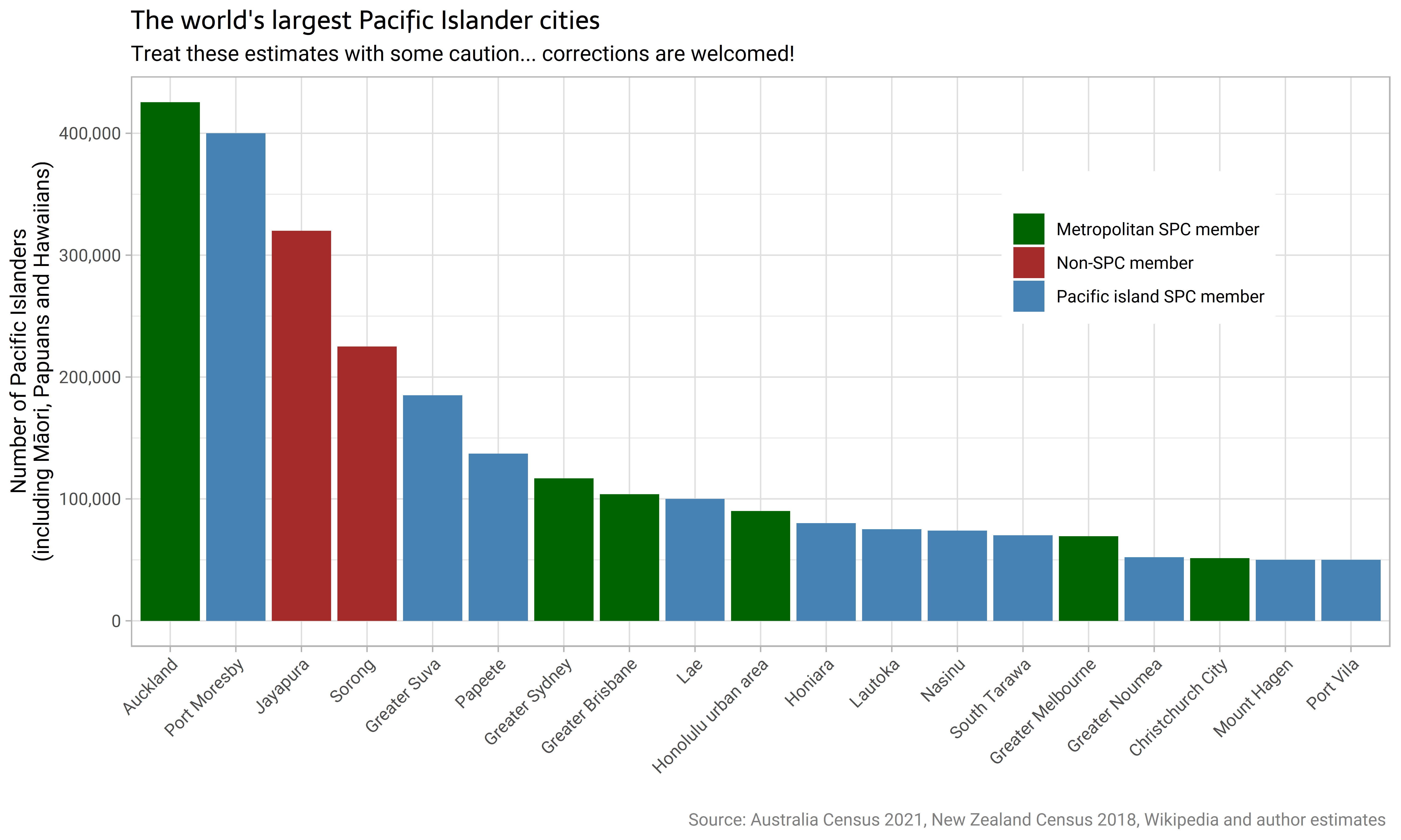 The real difficulty, and one I’m confident my solution for which could be improved, was in getting consistent definitions of “city” and good estimates of what proportion of that city are Pacific Islanders. The latter can come from census data, but I didn’t have time to go to each country’s latest census and ensure a comparable number, so had to resort to Wikipedia in some cases.
