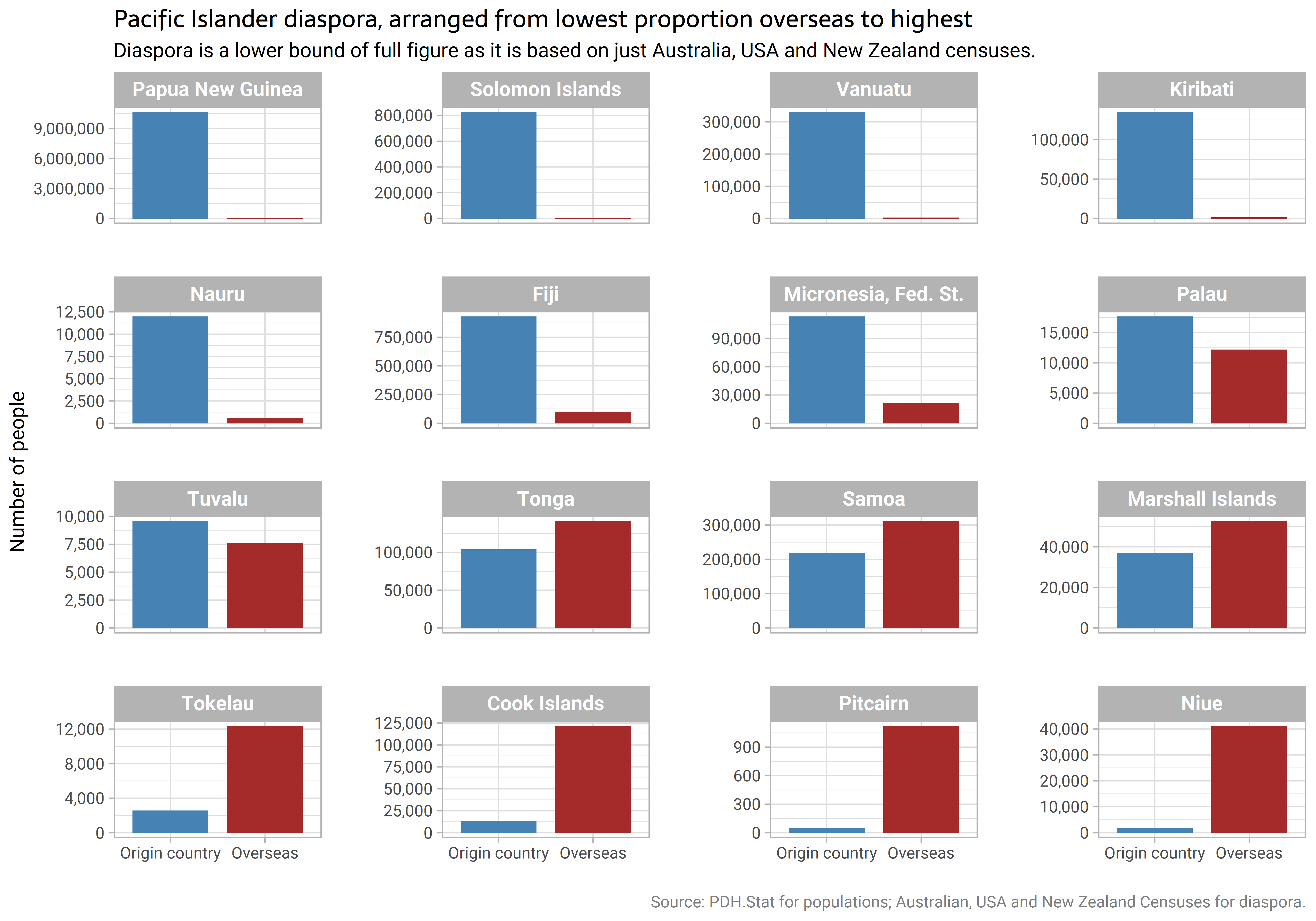 caption = "Source: PDH.Stat for populations; Australian, USA and New Zealand Censuses for diaspora.")An alternative (not so good) visualisation