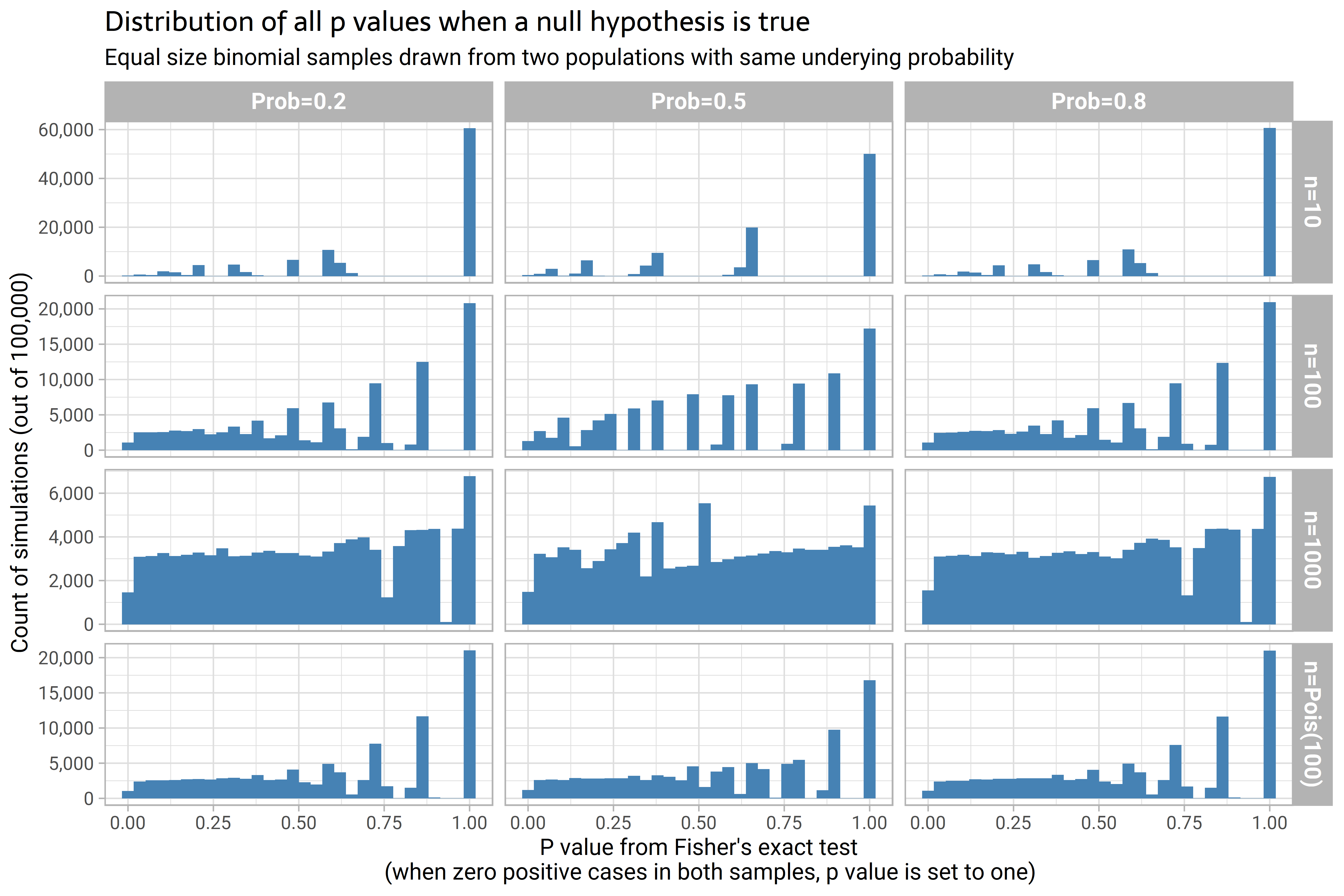 And that is exactly what we do see. Here is the full distribution of p-values for 100,000 simulations of each combination: