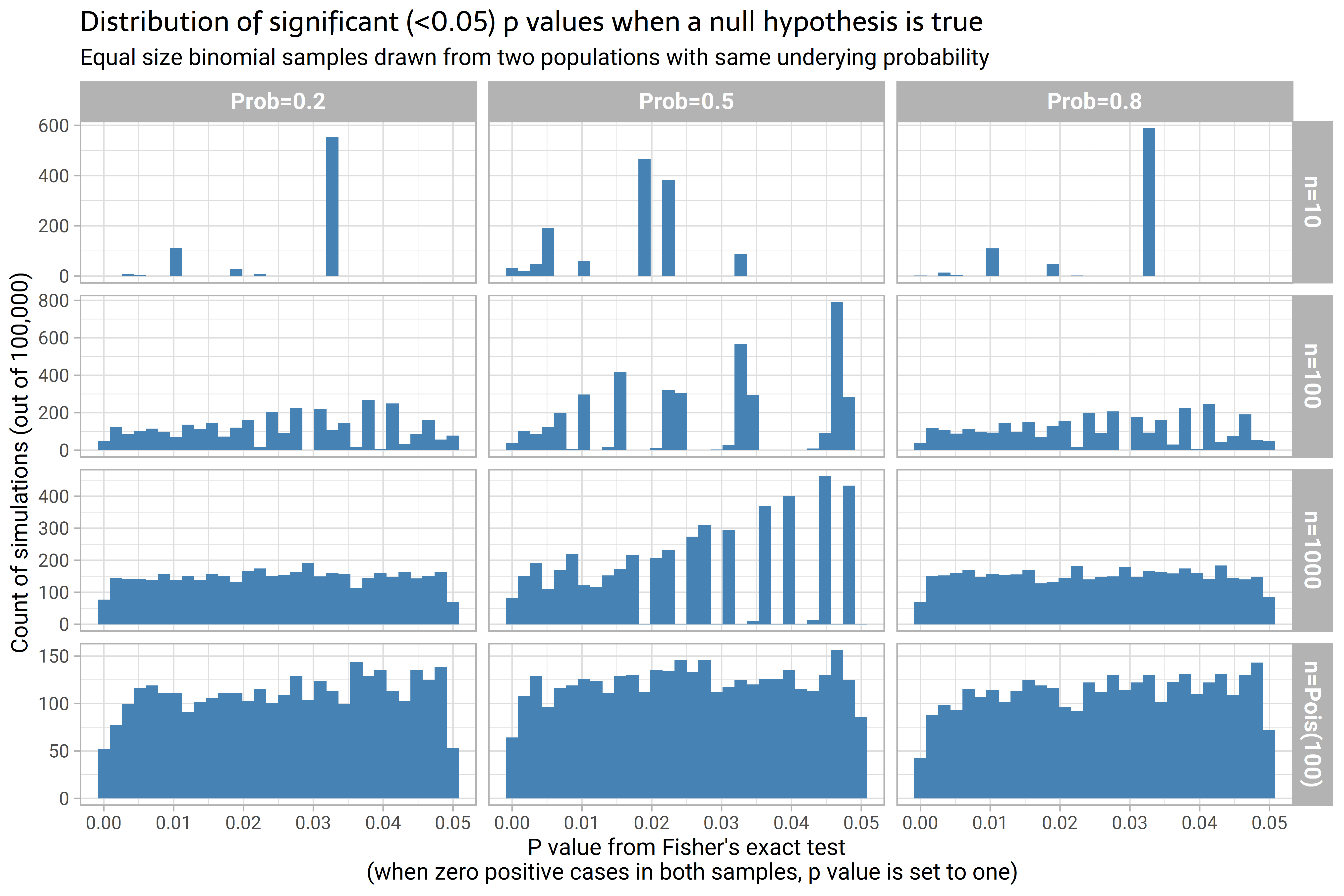 I wanted to check the case where we are comparing the number of “successes” in a relatively small sample of binary success/failure outcomes, split into two groups. The null hypothesis is that the underlying probability for success is the same in each group. I wanted to see the distribution of the p-value for a test of this null hypothesis with sample sizes of 10, 100 or 1000 observations in each group; for different values of the underlying probability of success, and for when the groups’ sample size is random but mean 100.