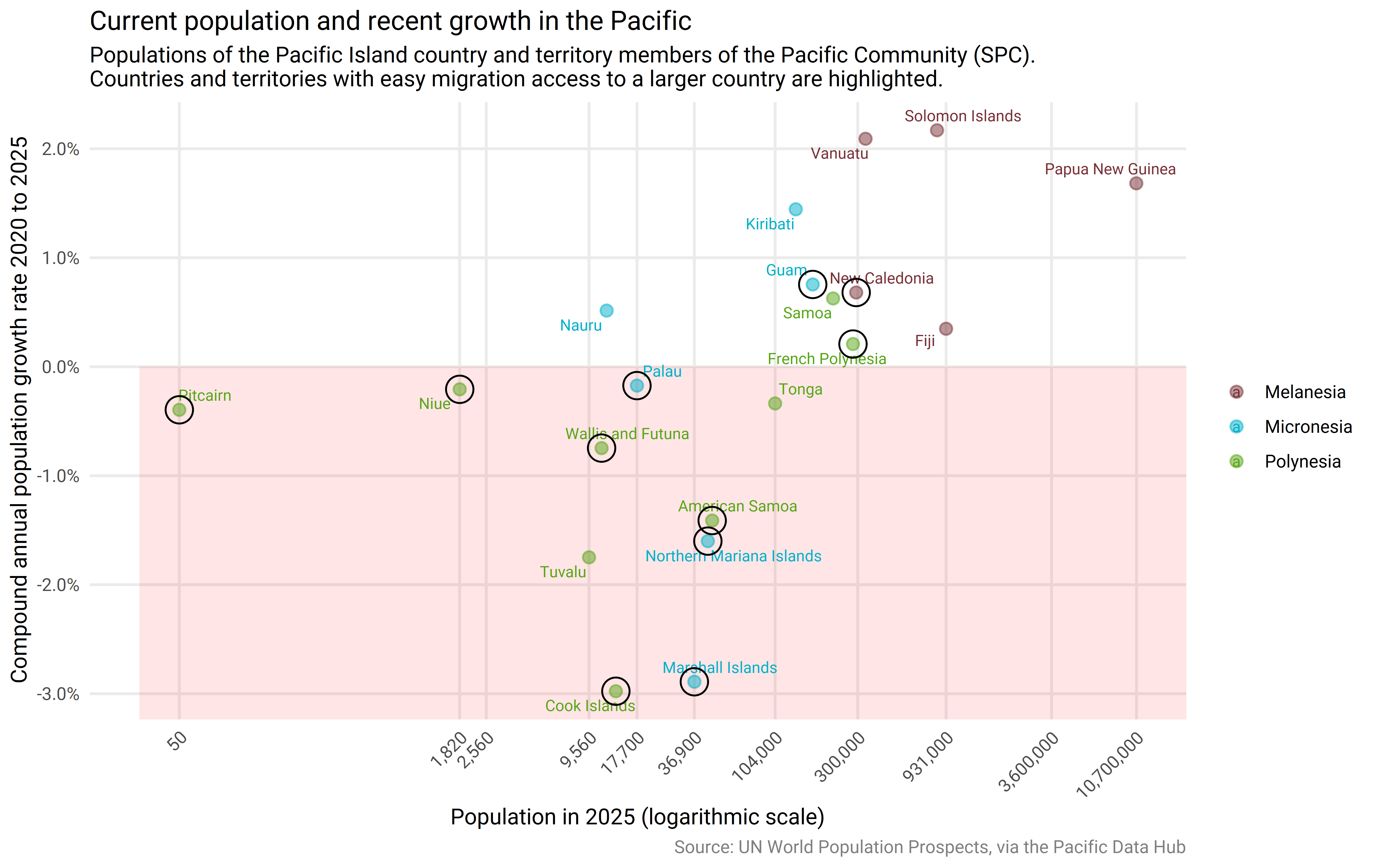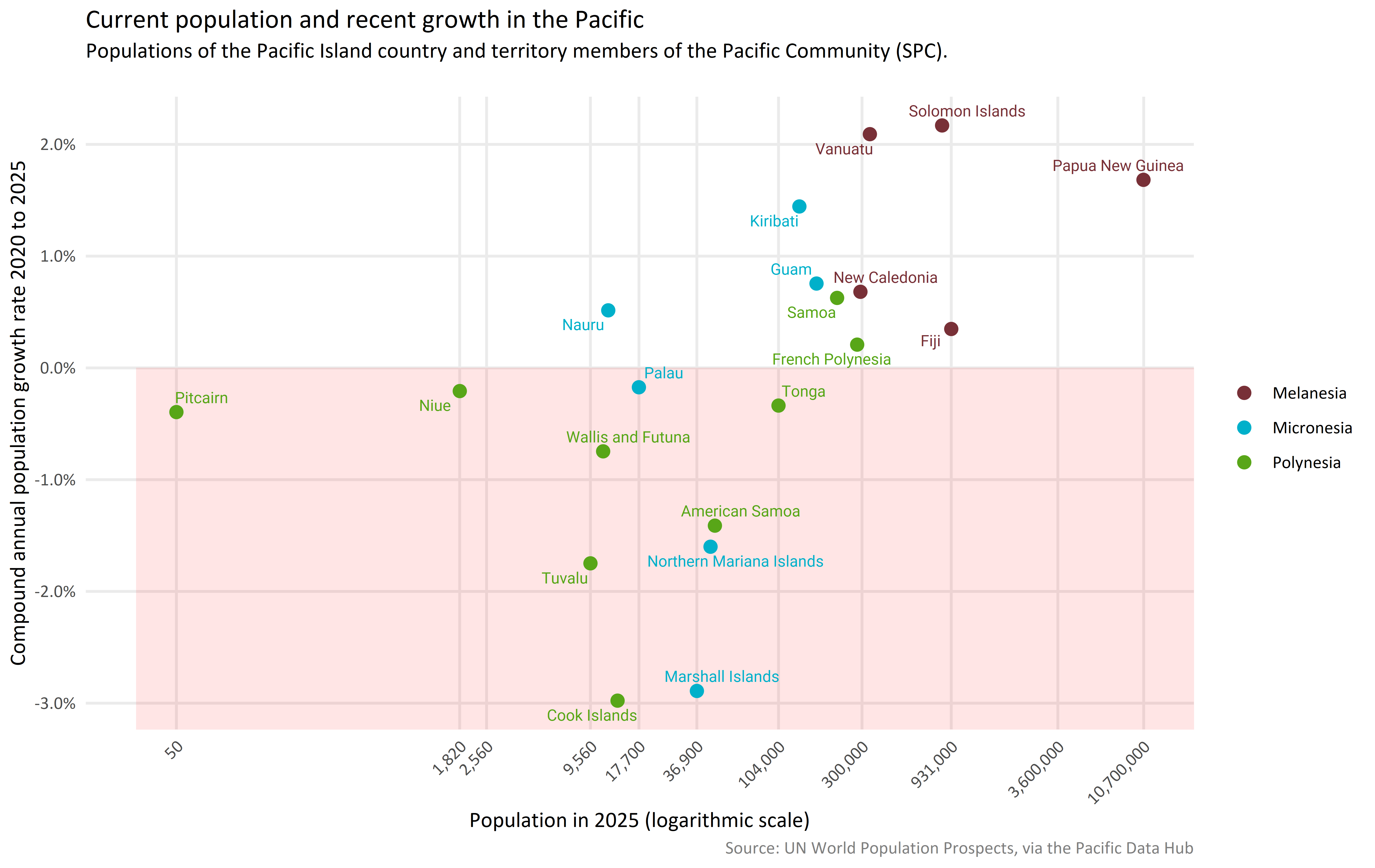 What I like about this plot is that it makes clear the two broad categories of Pacific island countries and territories in population terms: relatively large (meaning >100,000 people!) and growing, which is all of Melanesia and a few others; and small and shrinking, comprising most of Polynesia and parts of Micronesia. Tonga, population estimated around 104,000, is the borderline case—all the countries larger than Tonga are growing in population terms; and nearly all those smaller than it are shrinking.