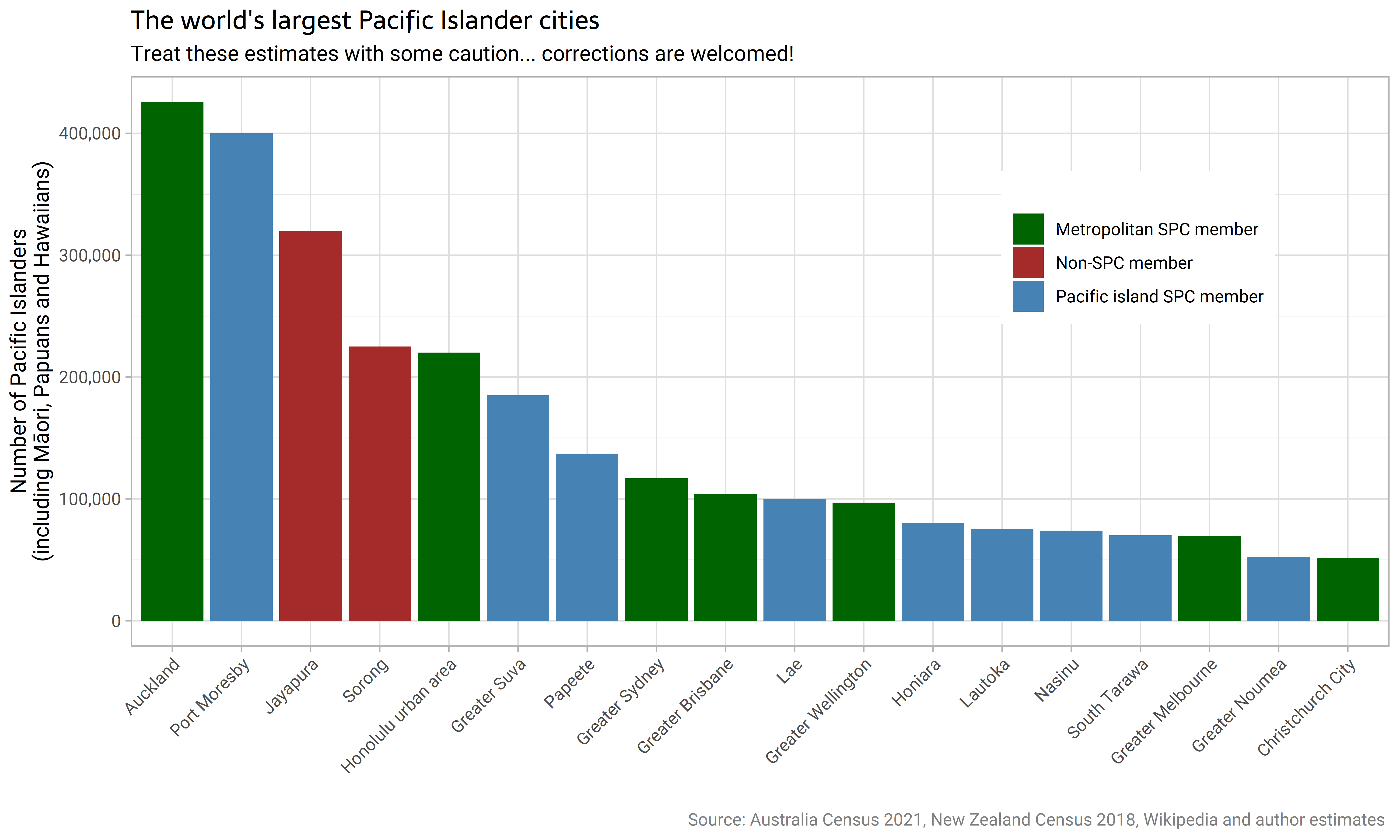 Illustrating this further, consider this chart of the world’s largest Pacific Islander cities. Thanks to comments on LinkedIn I have improved this from previous versions—we now have a better estimate of people with Pacific Islander as one ‘race’ of several in Hawaii, and a more comparable definition of Greater Wellington. But what we see is broadly the same message as before—of the top ten Pacific Islander cities in the world, two are in Australia (Sydney and Brisbane) and one each in New Zealand (Auckland) and the USA (Honolulu).
